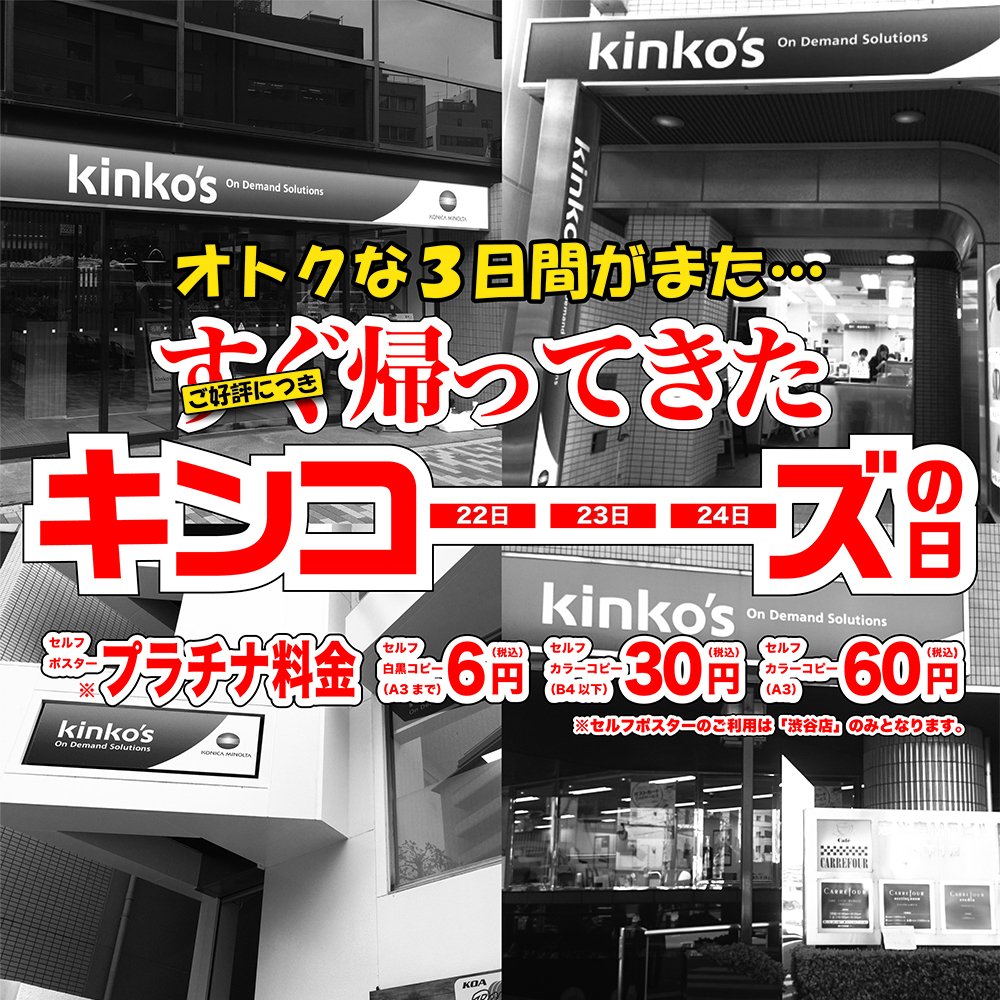 キンコーズ 公式 Twitterissa キンコーズ 渋谷店 この三日間渋谷店ではセルフポスター印刷も特別価格で提供しております A1サイズまで印刷できますので 興味のある方はこの機会に是非 皆様のお越しお待ちしております T Co Ynpdbb9g1t