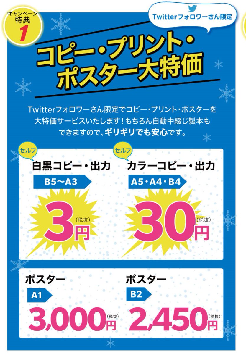 キンコーズ 公式 Ar Twitter サークル応援週間 19冬 特典 セルフコピー ポスター印刷特価 セルフ白黒コピー 出力 3円 税抜 セルフカラーコピー 出力 30円 税抜 ポスター普通紙 A1 3000円 税抜 ポスター印刷はオンライン入稿対応です 詳しくは18日公開の